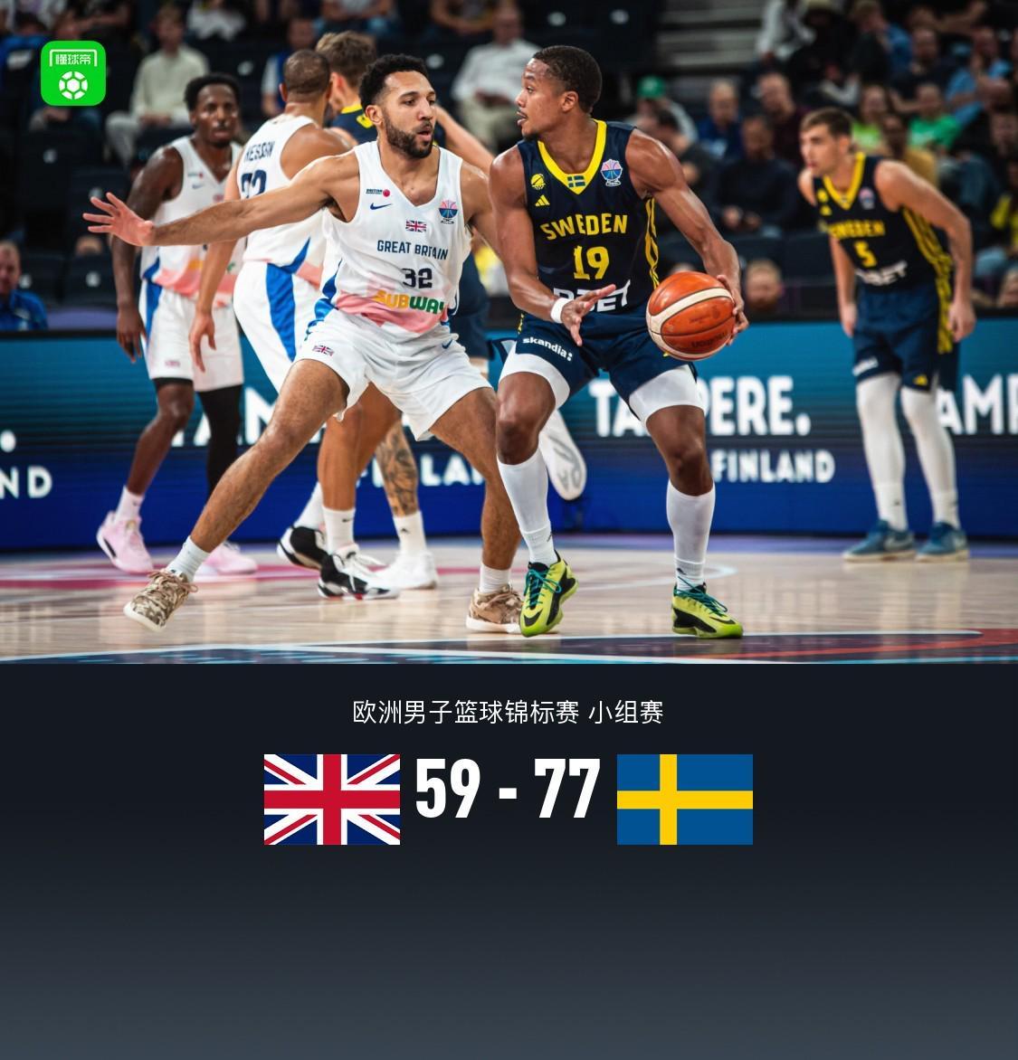 第四节英国男篮贝洛拿下7分,瑞典男篮拉尔森拿下4分,最终英国男篮59-77不敌瑞典男篮