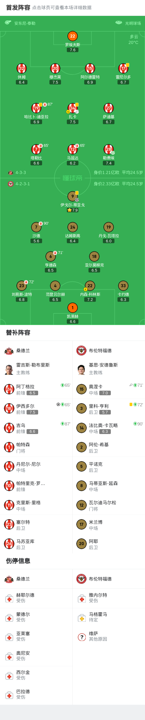 北京时间8月30日英格兰足球顶级联赛第3轮,桑德兰主场迎战布伦特福德。上半场,瓦塔拉单刀破门被判越位进球无效;下半场,雷尼尔多获黄点套餐,沙德主罚点球被罗埃夫斯扑出,奥涅卡助攻蒂亚戈头球破门,勒费埃点射破门扳平比分,补时阶段扎卡助攻伊西多尔头球破门上演绝杀。最终比分桑德兰 2-1 布伦特福德。关键事件第59分钟,雷尼尔多获黄点套餐,沙德主罚点球被罗埃夫斯扑出...