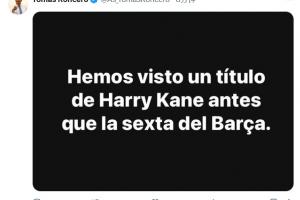 《阿斯报》主编、皇马球迷龙赛罗在社媒上发布图片,上面写着:我们在巴萨拿第六座欧冠前见证了凯恩夺冠。
